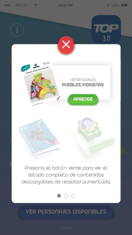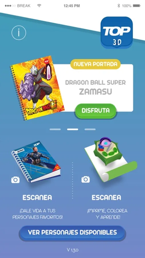 ¡Descarga TOP3D y dale vida a tus personajes favoritos! ¡TOP3D, la única aplicación completamente gratuita que te permite interactuar con el Hombre Araña, Iron Man, Goku, Vegeta, Elsa, Buzz Lightyear, Mickey Mouse, Minnie Mouse y muchos más. Para poder jugar, es necesario comprar los cuadernos TOP con licencia, disponibles en todos los mercados y supermercados de Bolivia. ¡Descarga la aplicación y escanea la tapa de tu cuaderno, verás tu superhéroe favorito aparecer en 3D y podrás hasta sacarle foto mientras te muestra en vivo sus superpoderes!