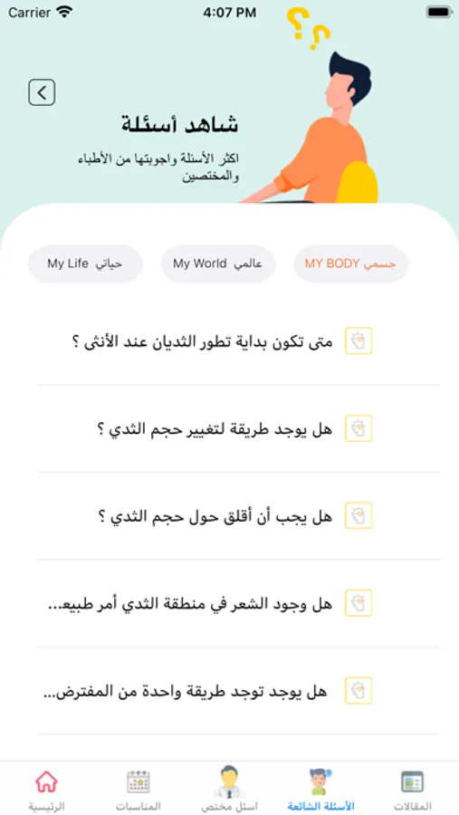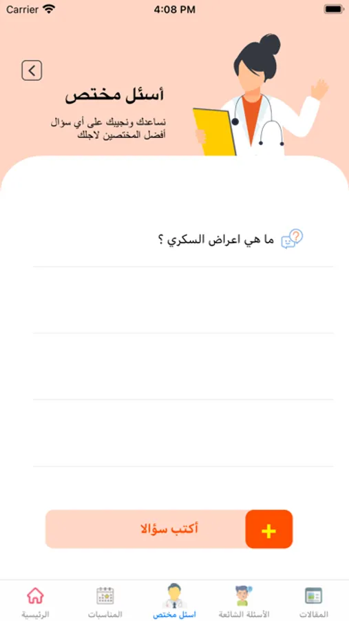 الاسئلة الشائعة: تتيح هذه الخاصية للمستخدمين تصفح الاسئلة الاأكثر شيوعاً التي تصل لفريق الخبراء من خلال التطبيق، ومشاهدة الأجوبة من الأطباء على هذه الاسئلة.