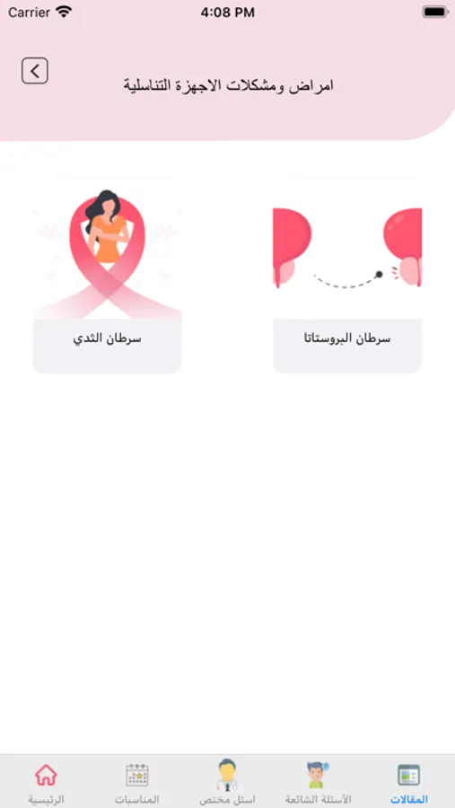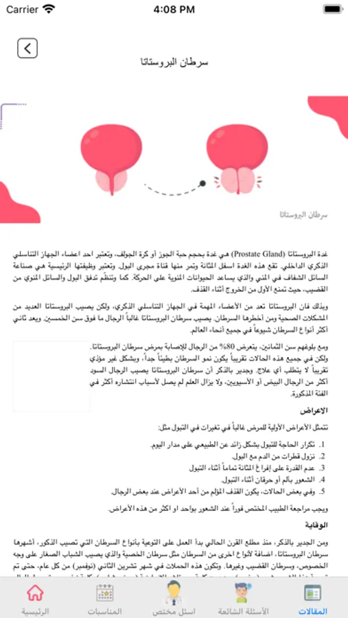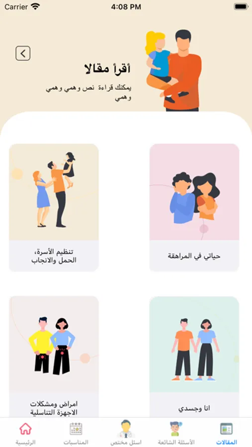 أقرأ مقالاً: من خلال هذه الخاصيّة يمكن للمستخدمين تصفح وقراءة مقالات شبابية متنوعة في مواضيع مختلفة بالصحة الانجابية والجنسية، تمت كتابتها من قبل شباب مختصين في مجالات الصحة ومراجعتها من قبل خبراء جمعية الاغاثة الطبية الفلسيطينية.