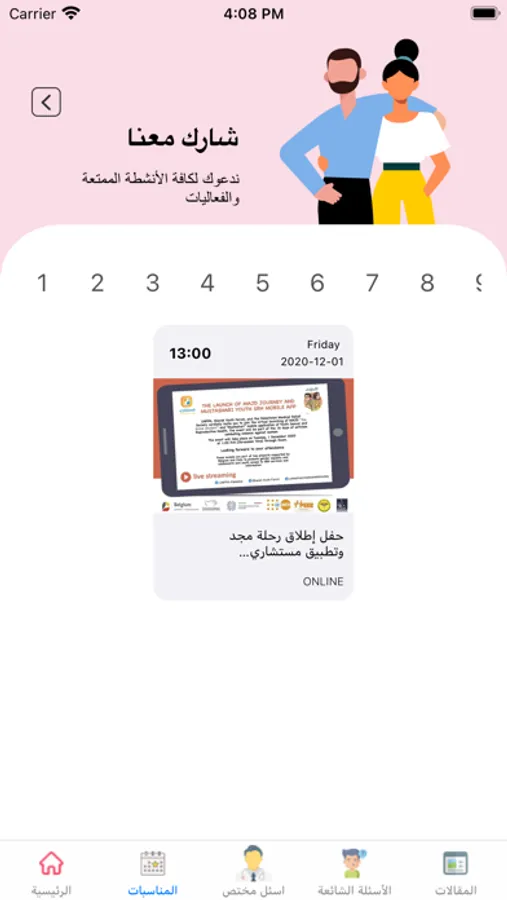 Events: this feature provides an annual calendar that includes all SRHR-related events in Palestine, where users can browse and participate in.