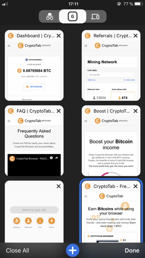 Add bookmarks, check history, keep favorites list, open multiple tabs at once — CryptoTab Browser works just as you expect it to. But it also has a sweet bitcoin cherry on top!