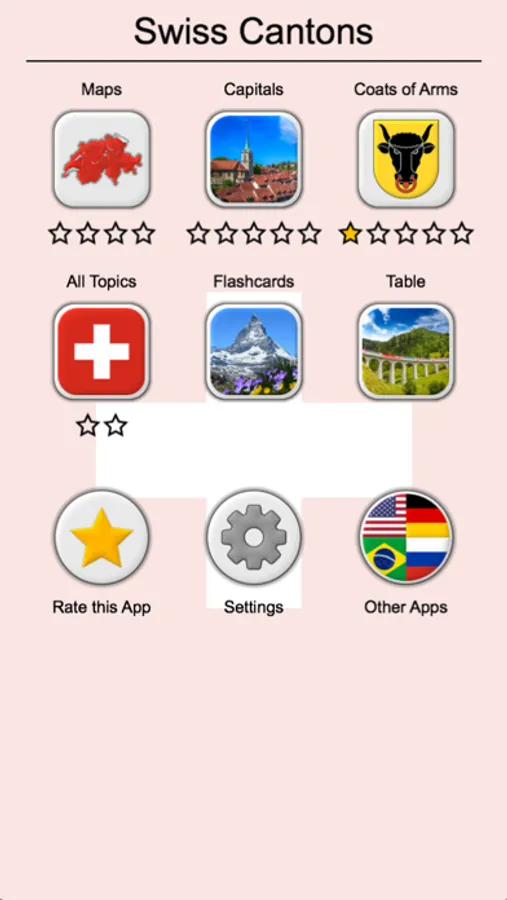 The app is translated into 9 languages, including English as well as official languages of Switzerland: German, French, and Italian. So you can learn the names of the Swiss cantons in any of them.