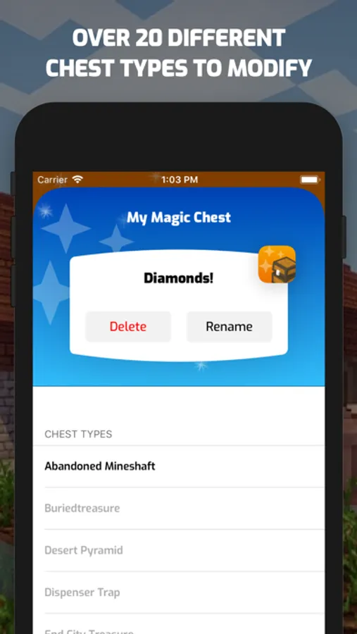 Magic Chests for Minecraft gives you the ability to choose any items you want to spawn in chests in your Minecraft world. Want diamonds in your spawn bonus chest? You got it! Magic Chests for Minecraft uses built in features of Minecraft to modify your own game worlds via add-on packs.
