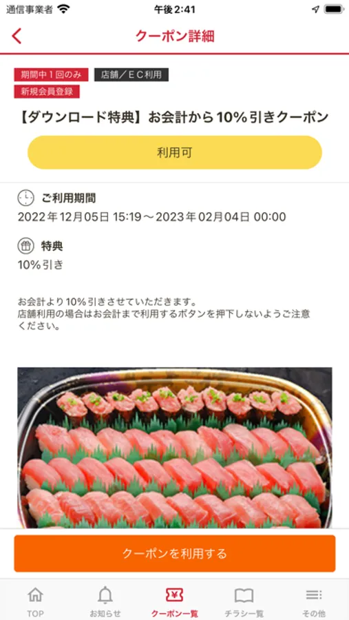 プッシュ通知などでお得な情報やフェアの情報などお知らせします。