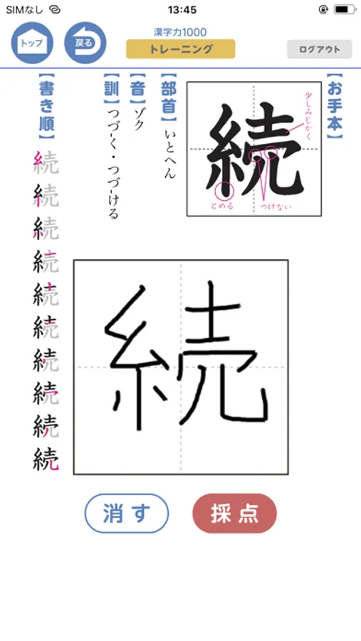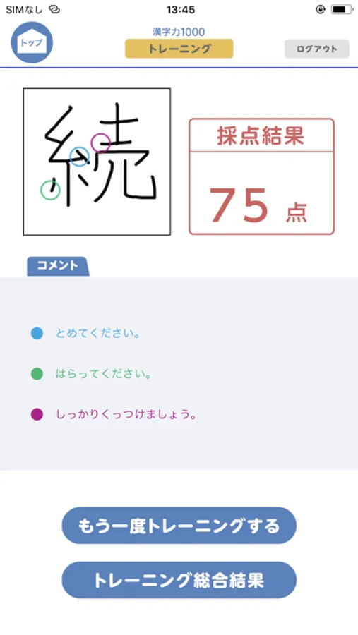 ・正しく書いているつもりでも、書き順や「とめ」「はね」など思わぬ勘違いをしている可能性があります。三角の判定を受けたら、トレーニングモードで文字の書き方をもう一度確認してみましょう。