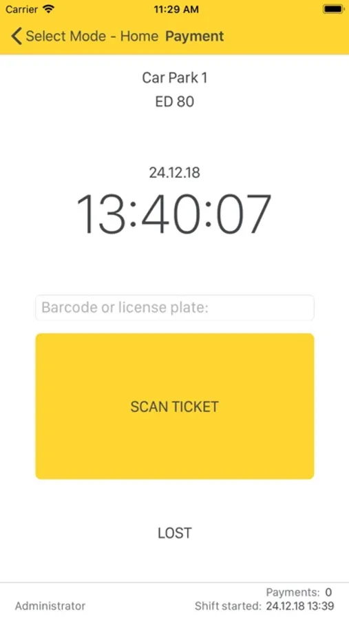 • Cashier mode: scans barcode tickets, handles payment and issues receipts.