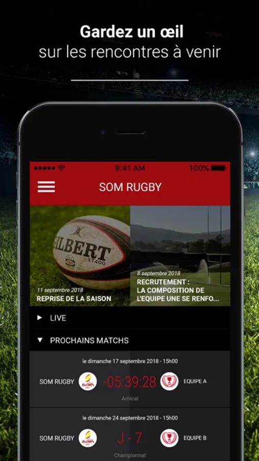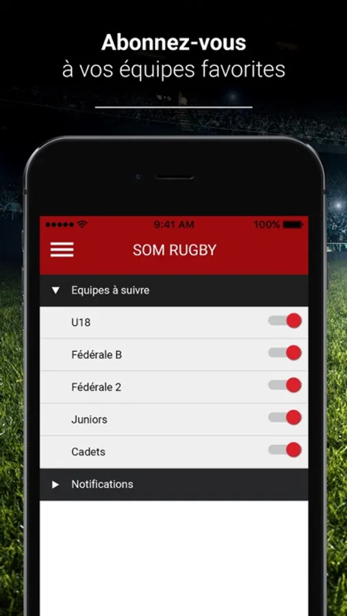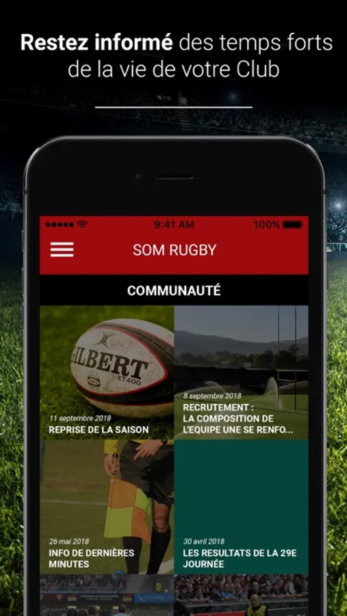 L’application SOM RUGBY vous permet de suivre toute l’actualité de votre Club favori. Vous pourrez vous abonner à vos teams préférées (équipe 1, cadet, U18, féminine,…) et suivre en direct chaque rencontre sportive faisant l’objet d’un Live. A vous de soutenir votre Club : l’application vous permet d’interagir avec l’équipe pour l’encourager ou pour siffler des séquences de jeu. Pas besoin de lancer l’application pour être au cœur de l’action. Les actualités de club ou la séquence de jeu vous sont envoyés par notification. Bons Matchs.