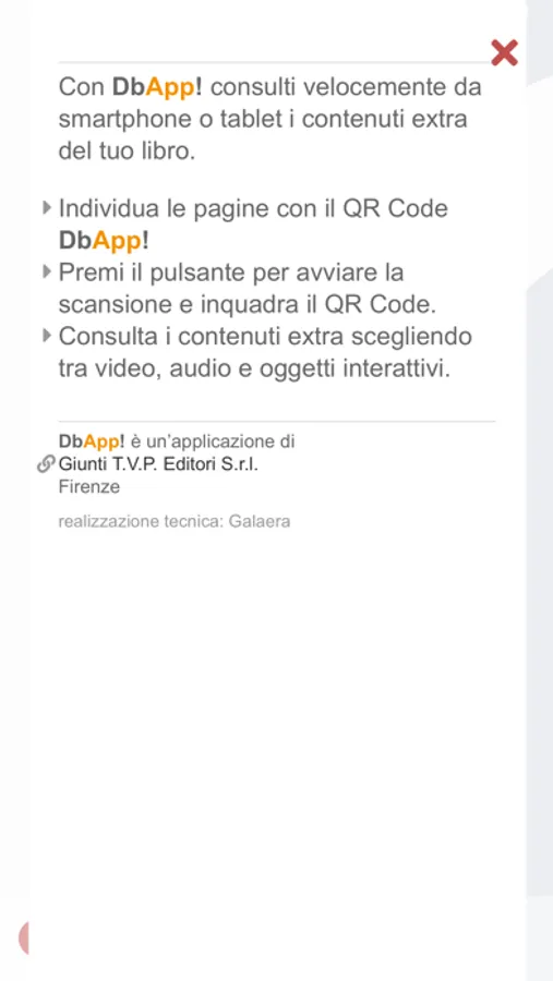 individua le pagine con QR Code DbApp!; premi il pulsante per avviare la scansione e inquadra il QR Code. Consulta i contenuti extra scegliendo tra video, audio e oggetti interattivi.
