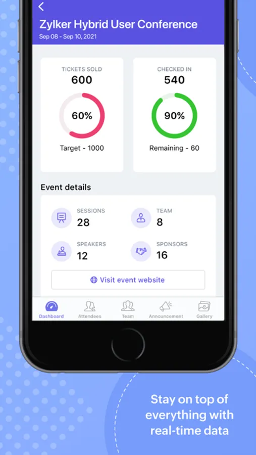 Get insight into your event's performance with real-time tracking of ticket sales. Once attendees start checking in, you can also know how many people are in attendance and how many are yet to arrive.