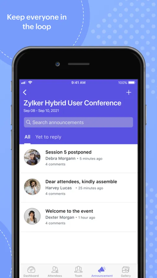 With timely announcements, you can ensure that no one is left out of the loop. Send real-time updates about sessions, speakers, and other impromptu happenings at your event right to your attendees' phones.