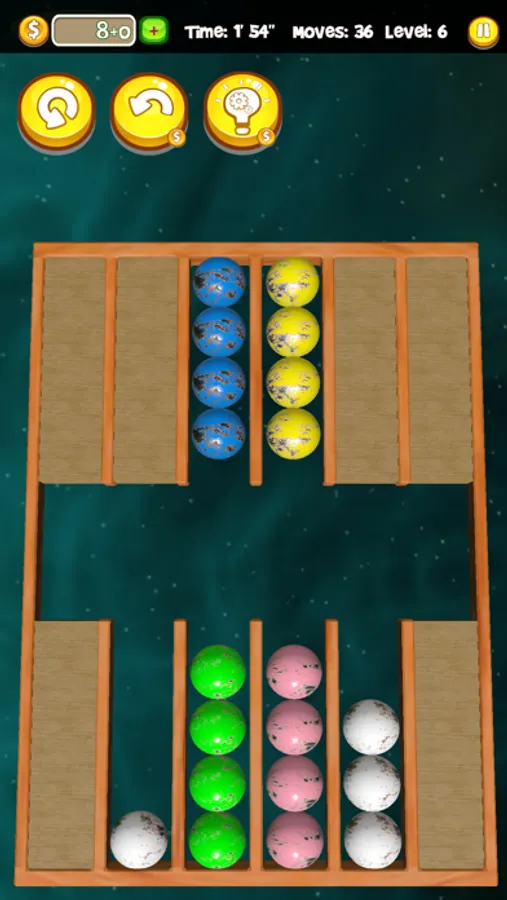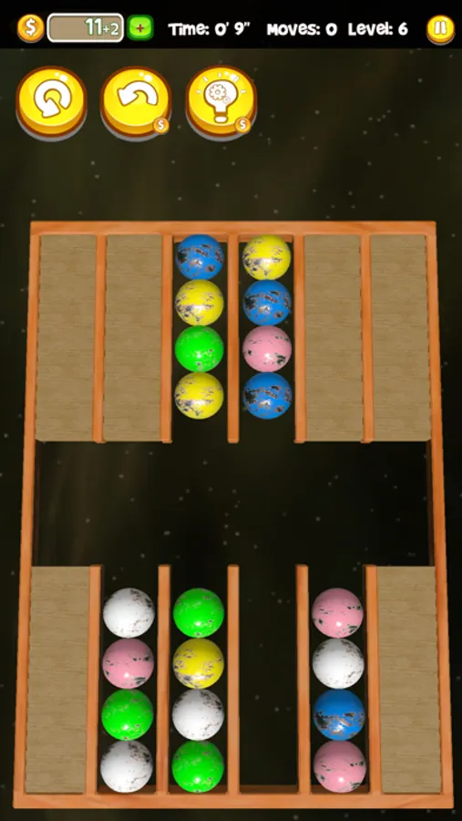 There are 12 slots in the playing area, each of which can hold up to 4 balls (up to 5 at higher levels). Initially, the balls are arranged randomly, and your task is to sort them out so that only balls of the same color are in the same slot (thus forming a line of balls of the same color – a color line). Balls can only be moved according to the following rules: