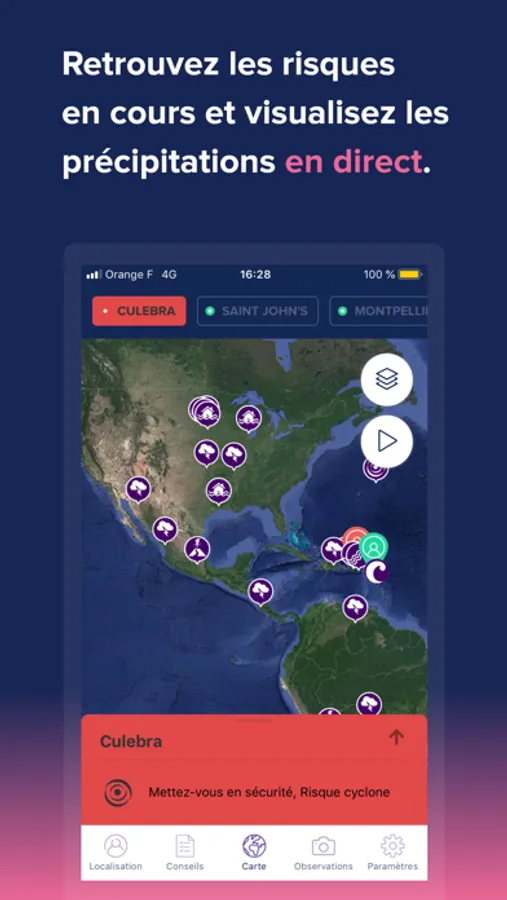 En cas de risques hydrométéorologiques, soyez averti et informez vos proches en sélectionnant plusieurs localités d’intérêt pour lesquelles recevoir des notifications push. Avec cette fonctionnalité (5 adresses possibles et la fonction « Géolocalisation Live »), vous saurez à tout moment si vos proches sont susceptibles d’être confrontés à un risque nécessitant la prise de précautions. L’application vous informe également lors de vos déplacements, où que vous soyez dans le monde.