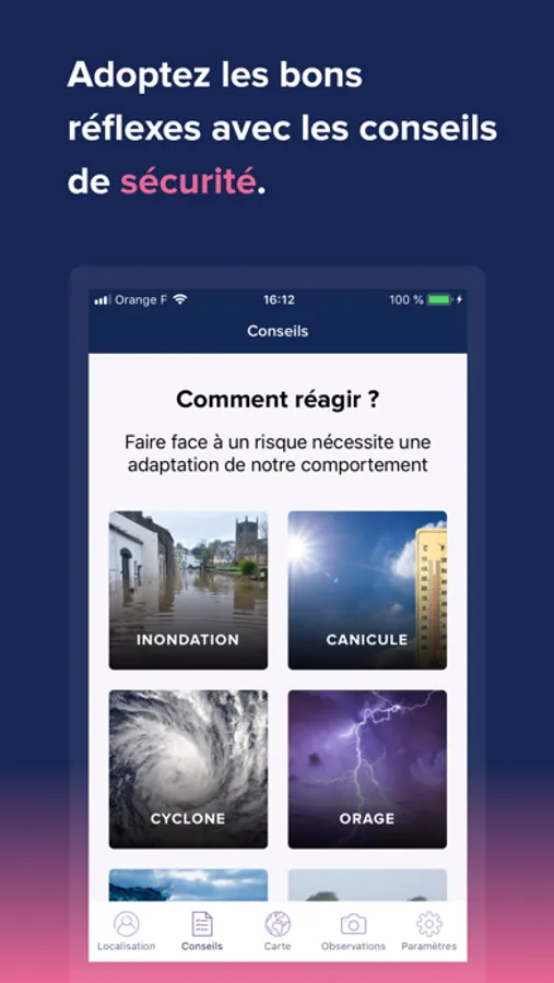 Afin de vous conseiller sur l’attitude à adopter face au risque, des conseils comportementaux gradués sont proposés pour chaque phénomène. Grâce à ces informations, prenez les mesures appropriées pour votre sécurité, celle de vos proches, ainsi que vos biens.