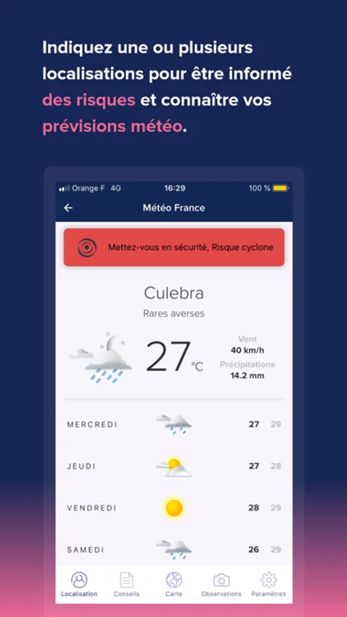 Bénéficiez de prévisions météo et d’avertissements personnalisés directement sur votre portable pour les localités de votre choix et lors de vos déplacements, en France et à l’international. Ne vous faites plus surprendre et adoptez les bons réflexes en suivant les conseils adaptés à chaque situation, selon la nature et l’ampleur du risque diagnostiqué.