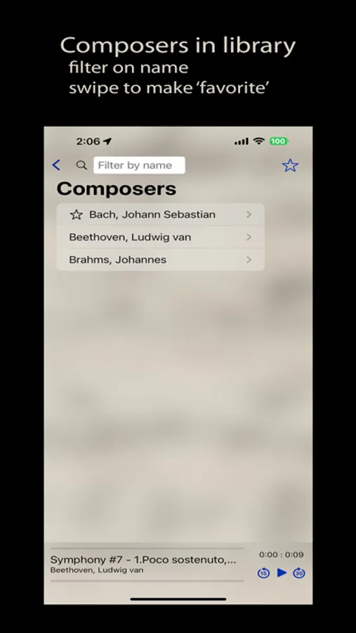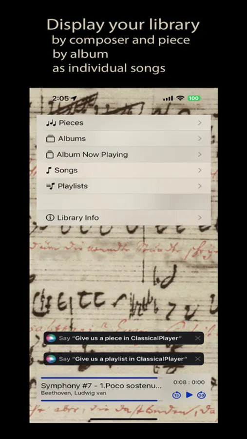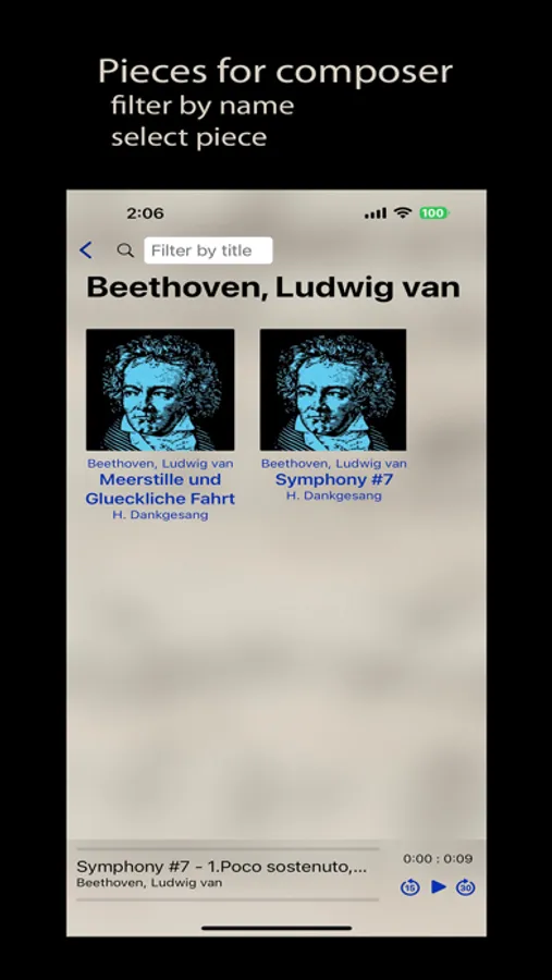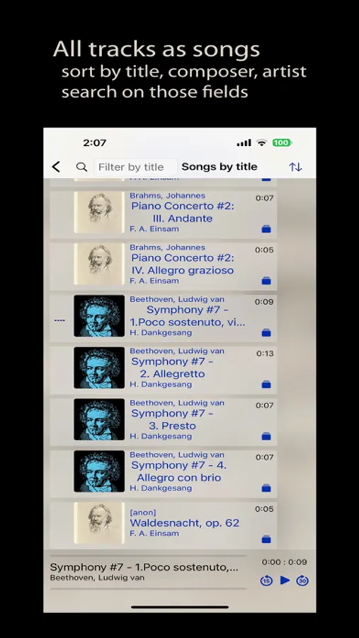 ClassicalPlayer presents your iPhone's or iPad's music library to you arranged by composer and pieces. Choose, for instance "Beethoven," and from the list of pieces of his that you have, choose "Symphony no. 5", and see the 4 movements ready to play in order. Push the play button, and ClassicalPlayer plays the movements (in order) and then pauses.