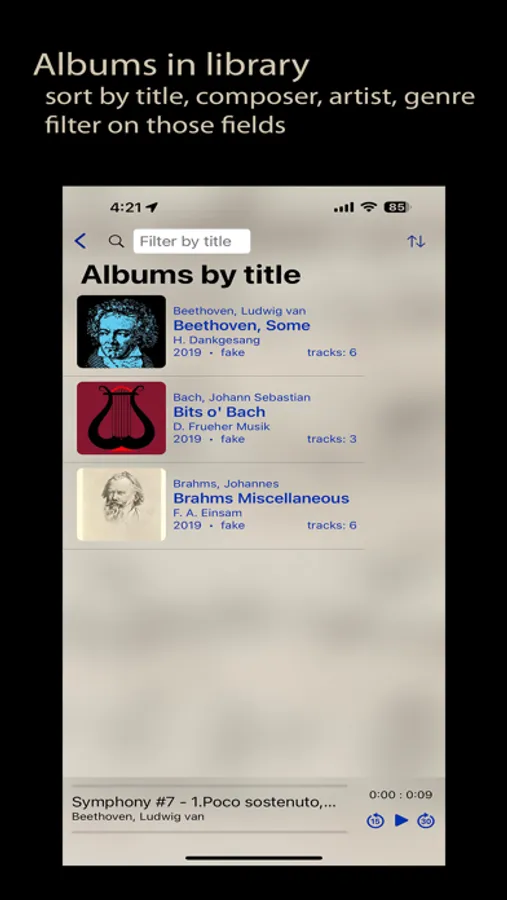 How does ClassicalPlayer find pieces, e.g., symphonies, in an album? By comparing the names of successive tracks. This isn't foolproof, but it works surprisingly well. ClassicalPlayer extracts piece and movement names from track names and presents your music organized by pieces.