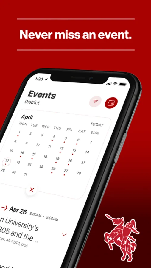 The event section shows a list of events throughout the district. Users can add an event to their calendar to share the event with friends and family with one tap.