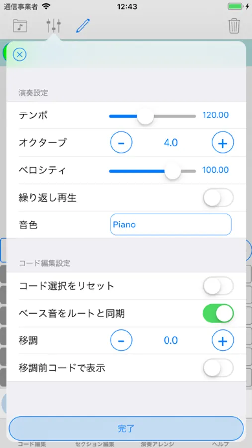 コード進行を再生する時のテンポ、音域、音量を変更できます。