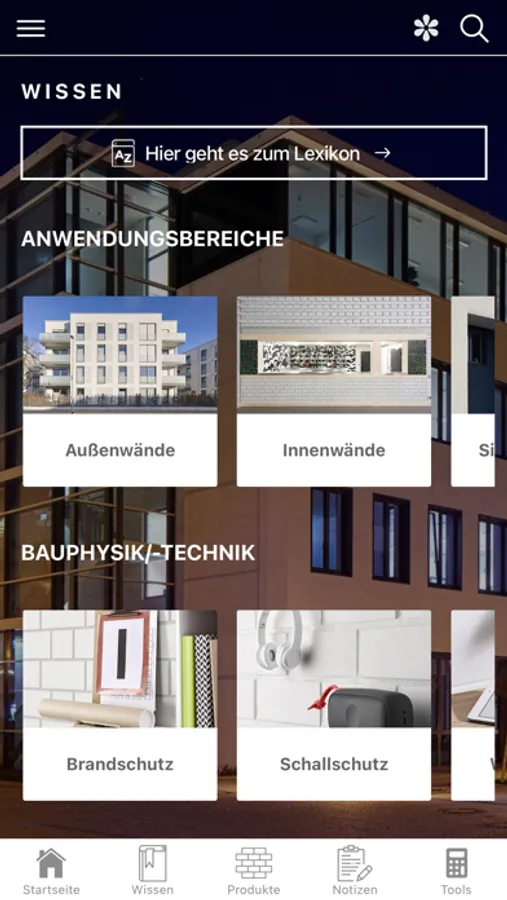 In komprimierter Form erhalten Sie alle wichtigen Informationen über die KS* Bauweise. Im Bereich Wissen finden Sie Inhalte zu Anwendungsbereichen, Bauphysik und -technik sowie zur Verarbeitung von Kalksandstein. Der Produktfinder im Bereich Produkte navigiert Sie komfortabel durch das vielfältige KS* Sortiment. Für den Schnellzugriff können Beiträge und Produkte individuell als Favoriten hinterlegt werden. Zum richtigen Ansprechpartner für Ihr Projekt gelangen Sie über die Partner-Seite. Des Weiteren können Sie direkt über die App Notizen erfassen und versenden.