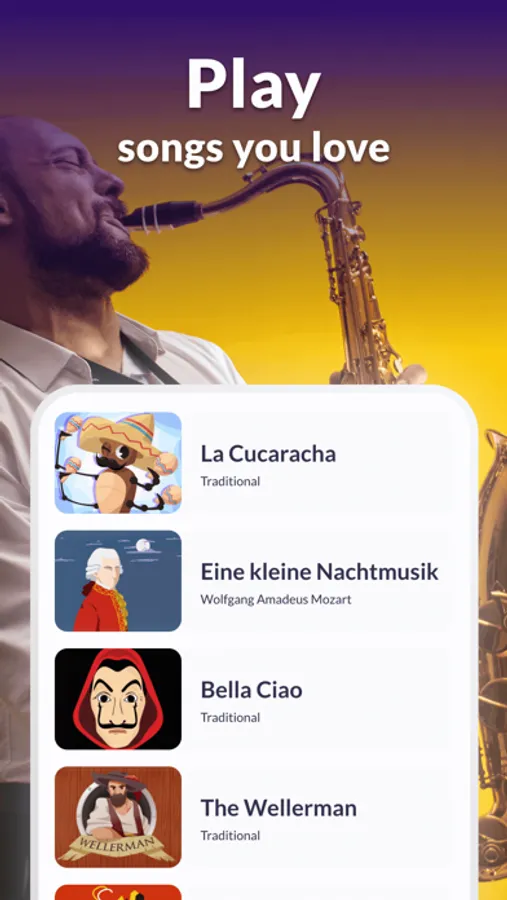 Discover songs from all music genres and play saxophone songs for every skill level. Whether you’re a fan of classical music or you prefer jazz songs instead: With tonestro’s large sheet music library you’ll find just the songs you need for playing your saxophone.