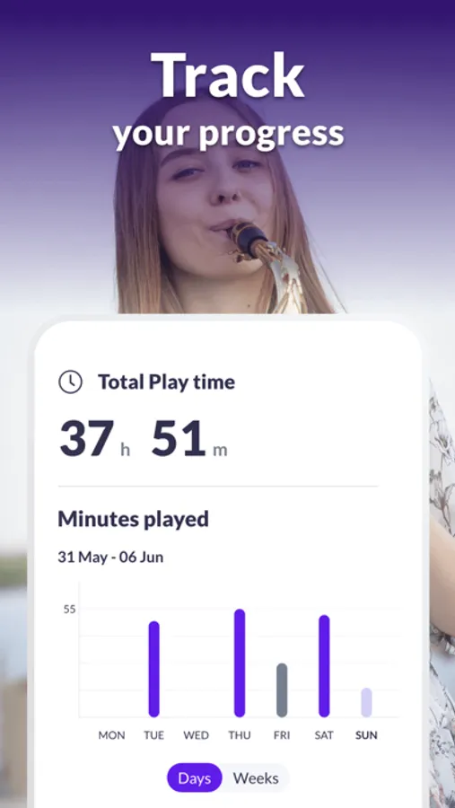 Weekly challenges with hand-picked songs give you the extra motivation to improve your skills when you compare yourself with saxophone players from around the world.