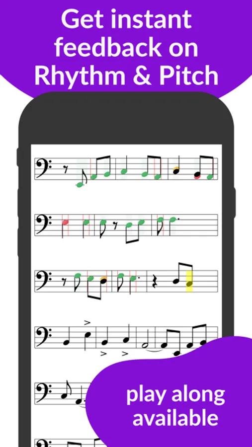 Use tonestro’s live-feedback feature on rhythm and pitch to improve your skills. See where you struggle with intonation and work on your pitch to become a better tuba player. Switch to practice mode and choose a slower tempo to work on getting that rhythm right. Let the metronome guide you through the songs and use the tuner to not only tune your tuba but also to see which notes are the ones you have to be very careful with pitch.