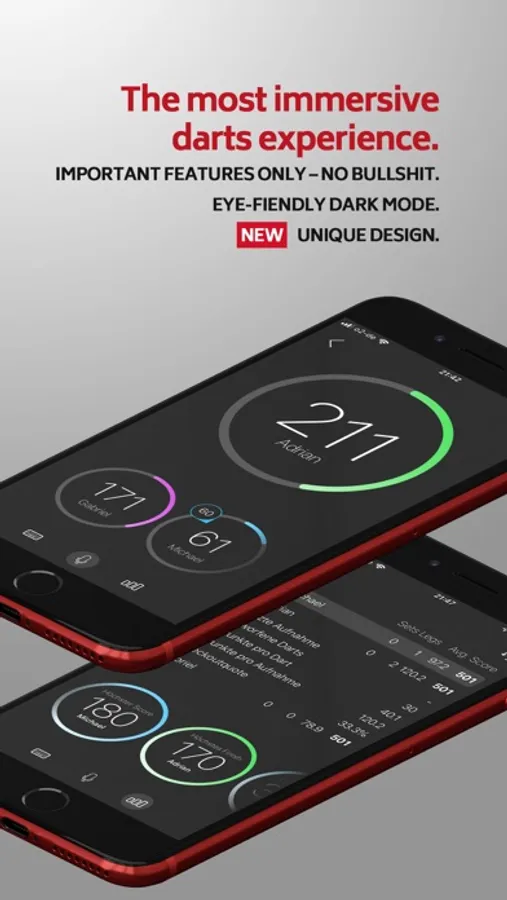 Keep an eye on your score and that of your opponent. Choose freely between the top dart game modes. A simple and modern design guarantees that you can see the most important things at a glance.