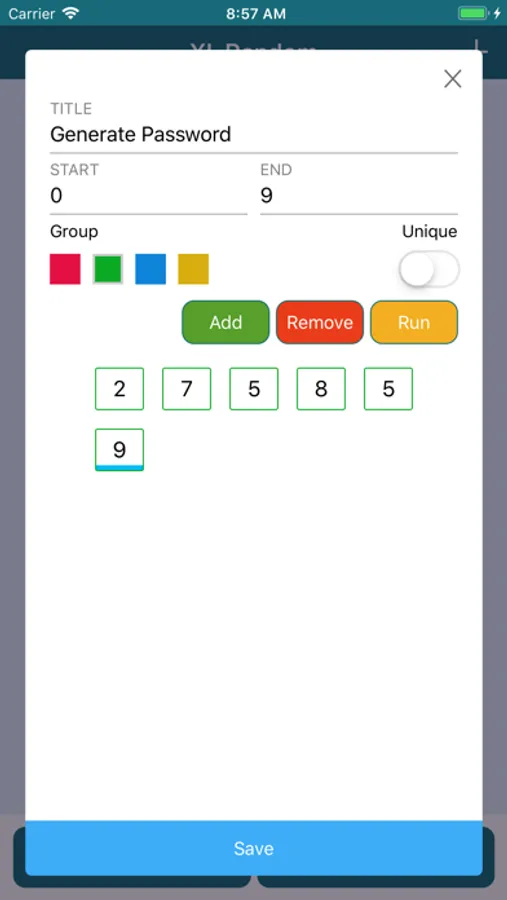 Create your random digit easily, supported random group, supported generate unique digit in same random group, each group is assigned with different color. Random function can save to local, you can create many function as you want, and reuse the random functions.