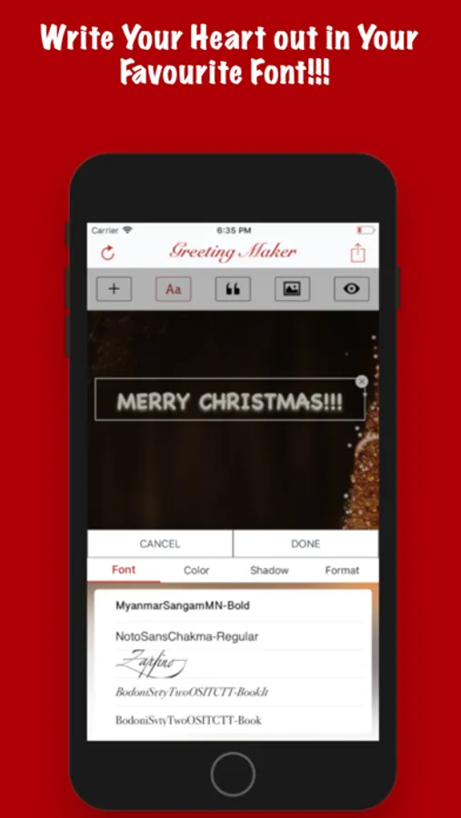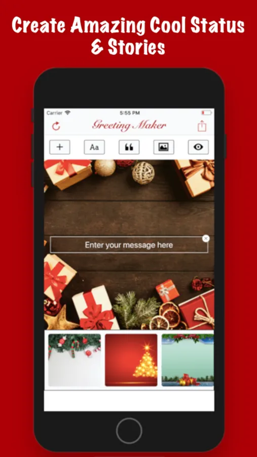 WIth our simple and user-friendly UI, create amazing cards in a jiffy! You can use your own photos for background or browse through our huge collection of backgrounds, add and format as many texts as you want and create your dazzling and colorful cards and share them with your friends instantly or save them for a later use! And ALL THIS is FOR FREE!