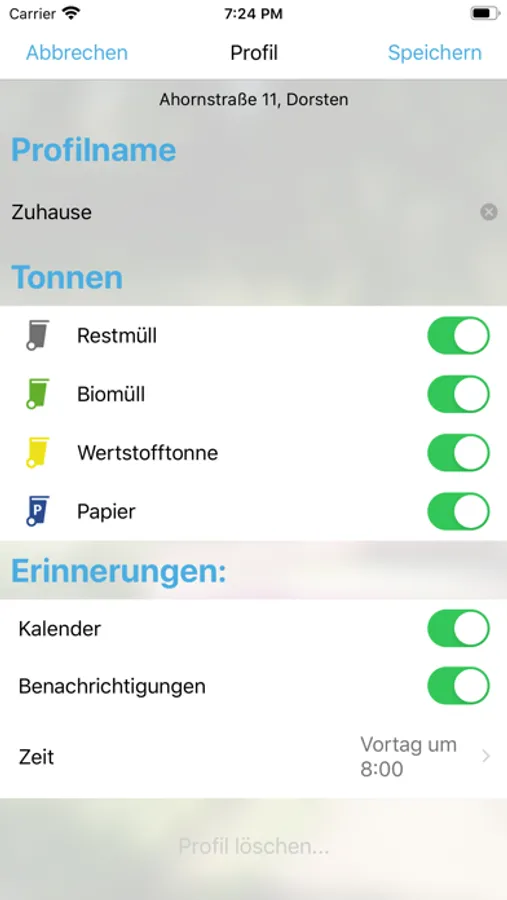 Bei der Profileinstellung wird ebenfalls festgelegt, ob das Smartphone an die bevorstehenden Abfuhrtermine über die Lokale Benachrichtig und / oder über den Kalender erinnert. Außerplanmäßige Terminänderungen werden in beiden Fällen berücksichtigt.