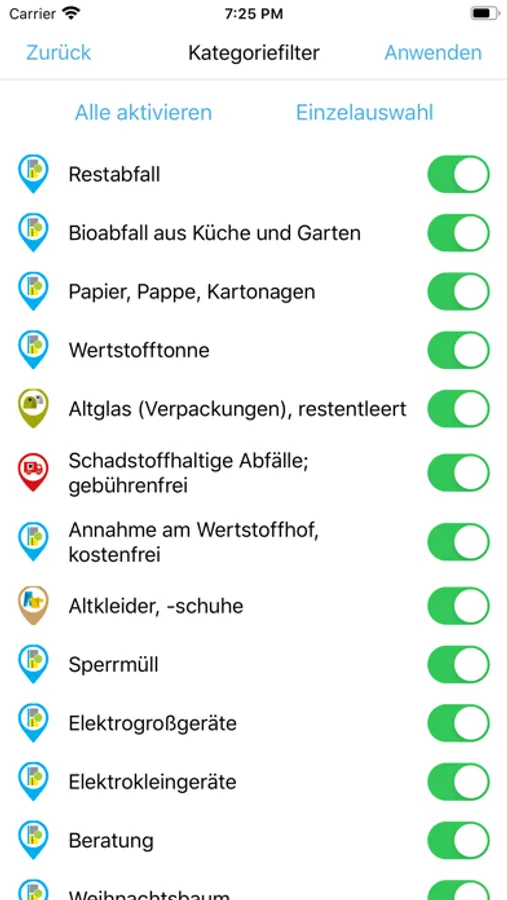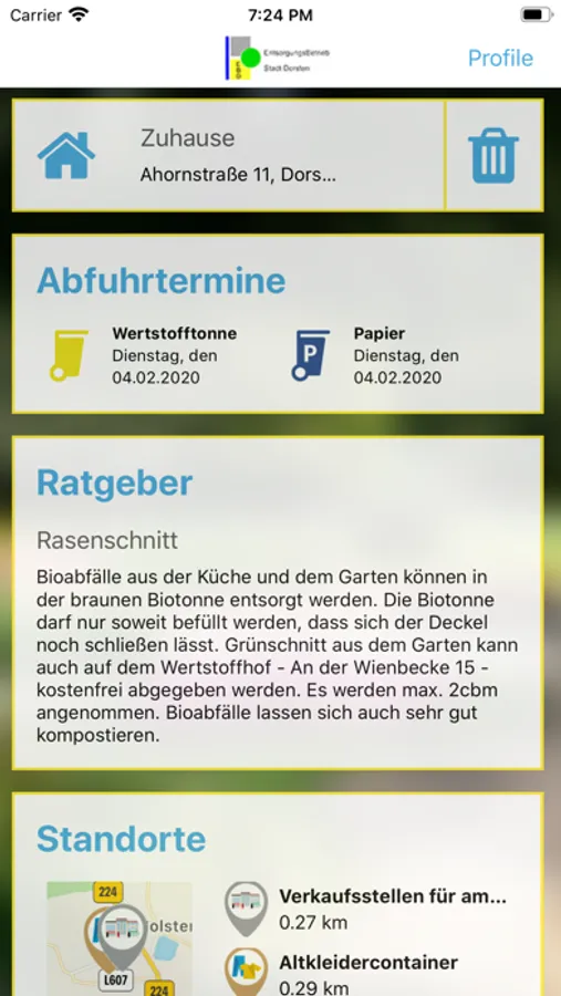 Welcher Wertstoff kann wann, wo und wie entsorgt werden? Die abfallapp ermöglicht den schnellen Zugriff auf die individuellen Abfuhrtermine. Sie werden an alle Termine für maximal fünf Standorte nach vorheriger Einstellung erinnert. Im Profil werden die persönliche Standorte ausgewählt. Über einen Schieberegler wird eingestellt, über welche Abfuhrtermine eines bestimmten Wertstoffes informiert werden soll.