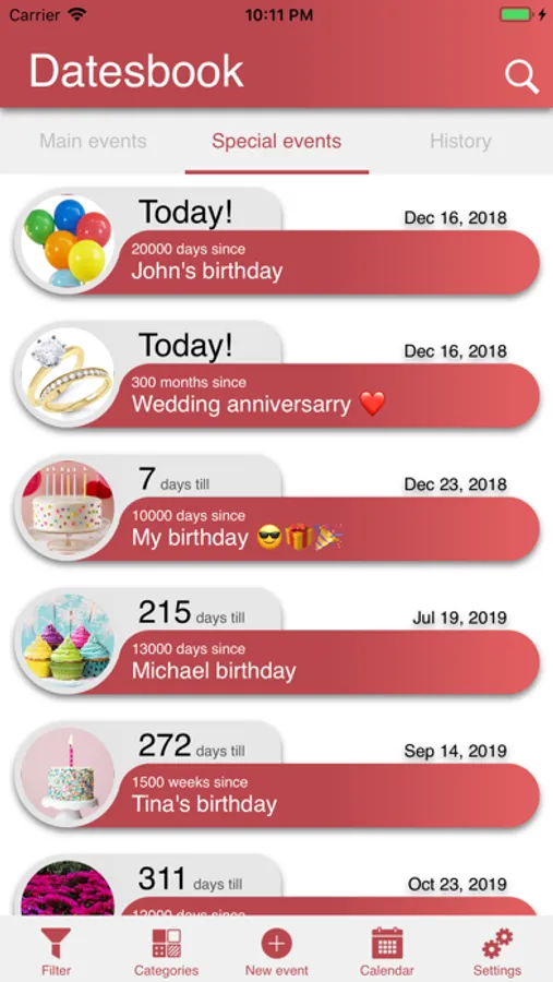 Special events - special category of events that show when there will be a special day to celebrate - e.g. 10 000 days, 2 000 weeks, 500 months after the date of main event. Special events are calculated, shown and reminded to you by Datesbook.
