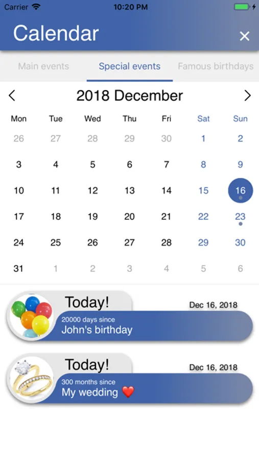 # App will calculate all upcoming special events for the next 1 or 2 years;