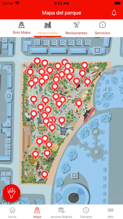 - Mapa del parque: Mapa georeferenciado del parque de Fantasilandia con selector de Puntos de interés de juegos, restaurantes, y servicios.
