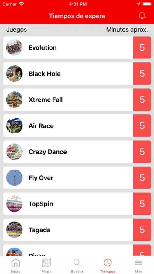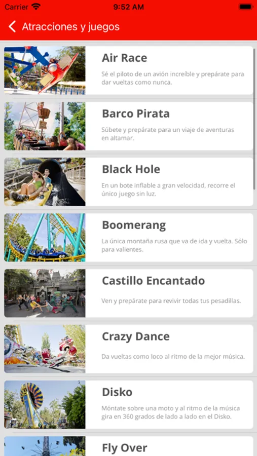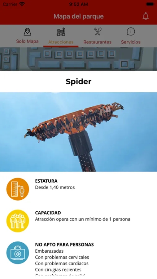 Cuenta con la descripción de cada uno de los juegos, restricciones para subir, consejos y el tiempo de espera en las filas para que no te pierdas ninguno.