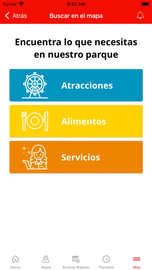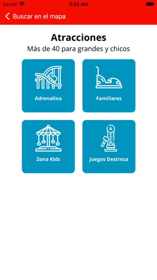 - Búsqueda en el mapa de puntos de interés mediante distintas categorías. Al filtrar un juego mediante esta vista se muestra la ubicación del juego en el mapa del parque.