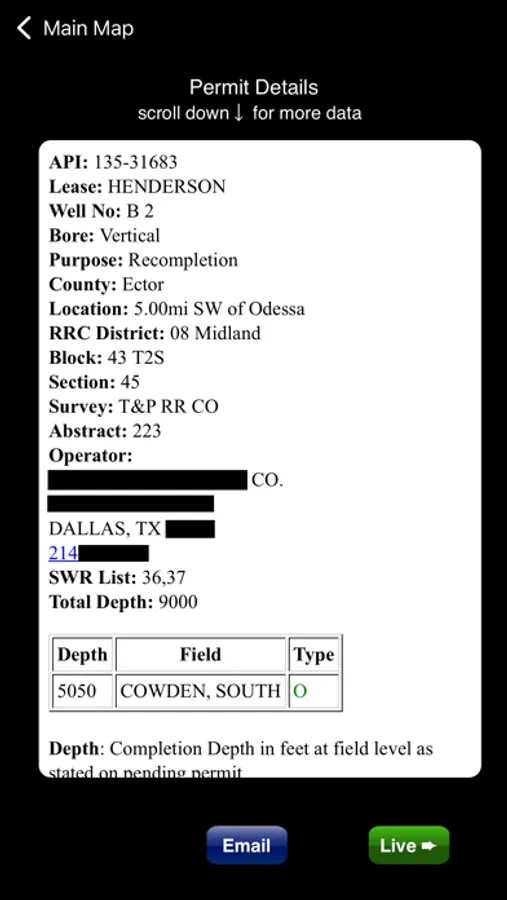 You may view the Railroad Commission web page for each selected permit by touching the "Live" button in the Permit Details view. Permit attachments may be accessed by clicking their links.