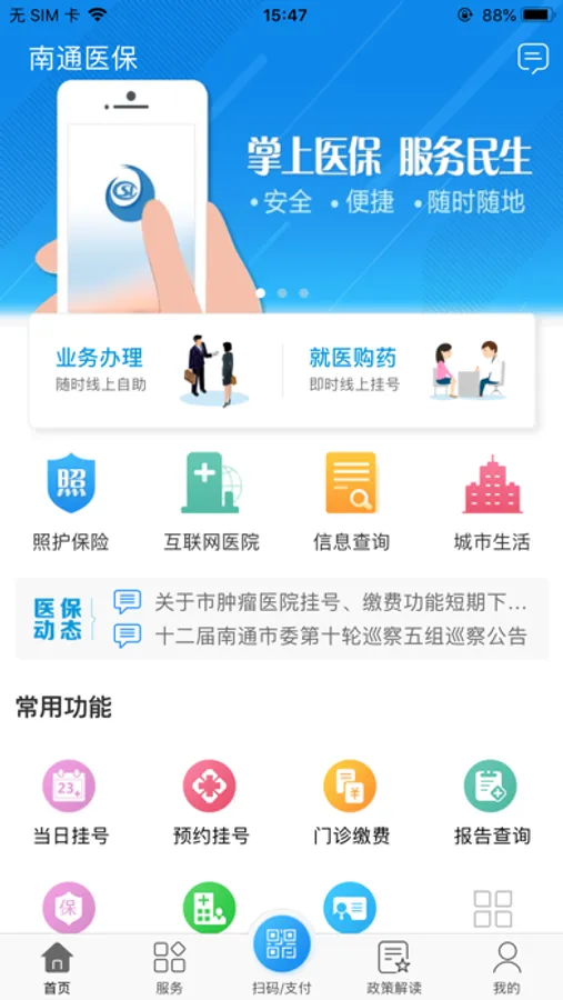 南通医保移动(支付)服务应用是南通市医疗保险基金管理中心秉持“心为民生 行悦百姓”服务理念,为广大医疗保险参保人员打造的“互联网+医保”惠民服务平台。该服务应用是以“电子社保卡”为核心,广泛借助合作银行、第三方支付平台等支付渠道,整合多家挂号资源,汇集医保公共业务经办、参保人员就医购药等多项功能于一体的民生实事工程,其面向南通市医保参保人员提供定点单位预约挂号、诊间缴费、就医购药个人现金和医保基金“一键式”支付和住院押金线上缴纳服务;提供医保定点单位信息、医保药品(诊疗项目)目录、政策法规、政策口径、热点问答等公共资讯和个人医保权益查询;为参保人员提供个人业务的“不见面”申办服务等。
