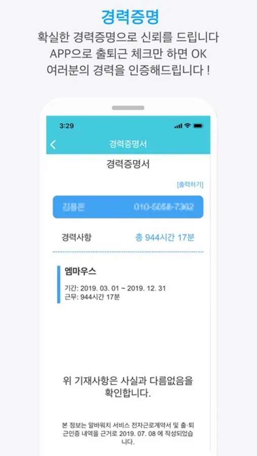 ㄴ 알바워치를 이용하여 출퇴근 체크를 하시면 자동으로 경력증명을 해드립니다.