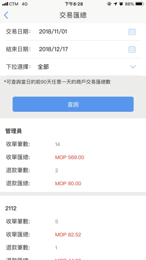 交易記錄全匯總,針對顯示不同操作員於自設期間內所作交易統計記錄。