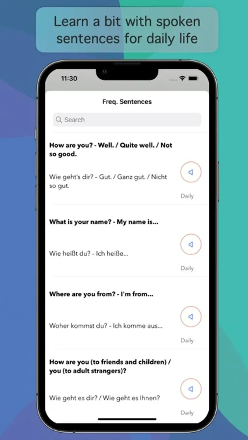 Frequently used sentences that work offline, with an included quick search, help you to navigate. Learn the most common sentences while staying and traveling in Germany because of included spoken sound files. Find sentences for Dinner or Business. Understand more of the spoken announcements at the railway station with this app. The most common announcements are in sound files audible.