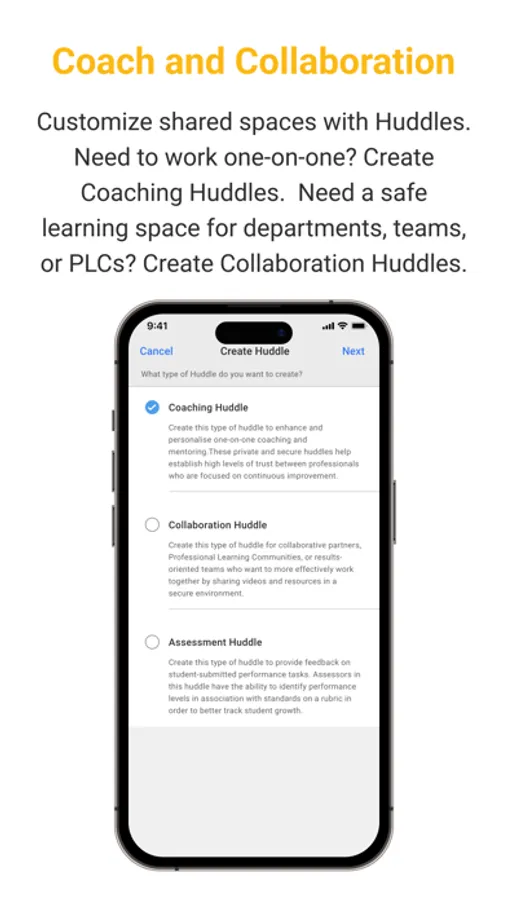 *Share, analyze, and annotate video at precise moments on the video with other participants in both coaching, collaboration, and assessment Huddles.