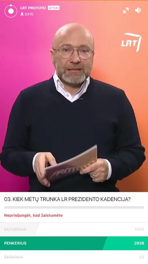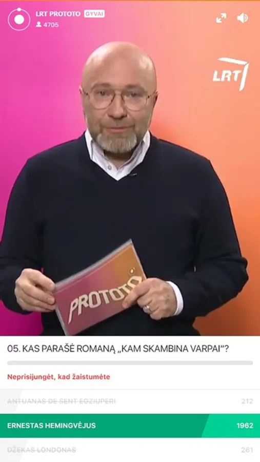 LRT „Prototo“ – protmūšio žaidimas, vykstantis kiekvieną antradienį 12.20 val. ir ketvirtadienį 20.40 val. tiesiogiai Jūsų išmaniuosiuose įrenginiuose! Greičiausiai atsakykite į visus klausimus ir laimėkite!