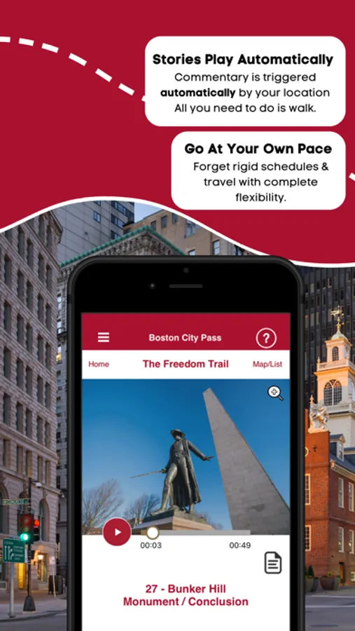Start in the Boston Common or Bunker Hill Monument and tour with total flexibility. Featuring riveting stories, a phenomenal narrator, and easy automatic audio, this app puts exploration in the palm of your hand!