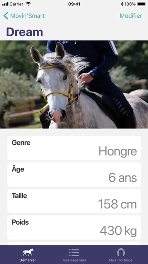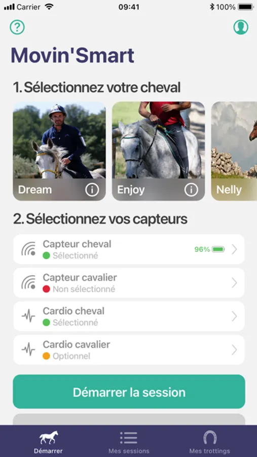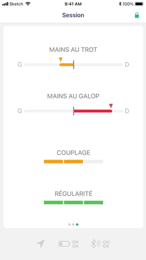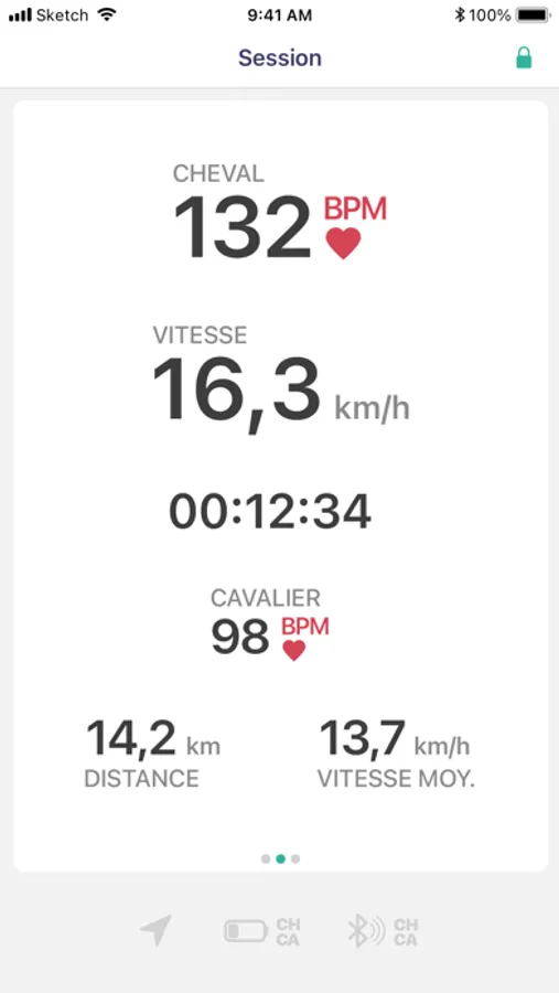 L’application, associée à la technologie MS100 Bluetooth de Movin’Smart, vous propose un tableau de bord complet des interactions du couple cavalier/cheval, le traitement et un retour d'informations en temps réel basé sur 2 capteurs : une solution exclusive ! Ces données (vitesse, distance parcourue, chronomètre, % d’utilisation des mains, indicateurs de couplage et régularité,…) vous informent sur la technique à utiliser et le travail à adapter au niveau d'entrainement du cheval.