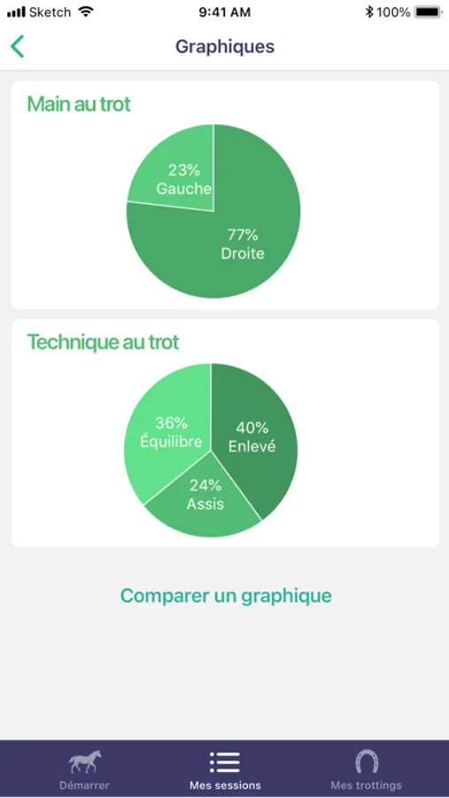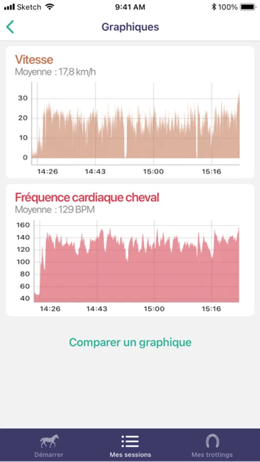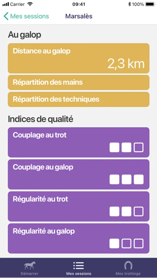 Une fois la session terminée, vous pouvez consulter votre bilan de séance. Vous pouvez sélectionner la zone temporelle à étudier à l'aide des curseurs et analyser votre séance: votre parcours, la distance parcourue (totale et par allure), afficher les graphiques de vitesse, de fréquence cardiaque du cheval (capteur non fourni), ainsi que les proportions d’utilisation de chaque main, de chaque technique de monte ou encore obtenir les indices de couplage avec votre cheval.