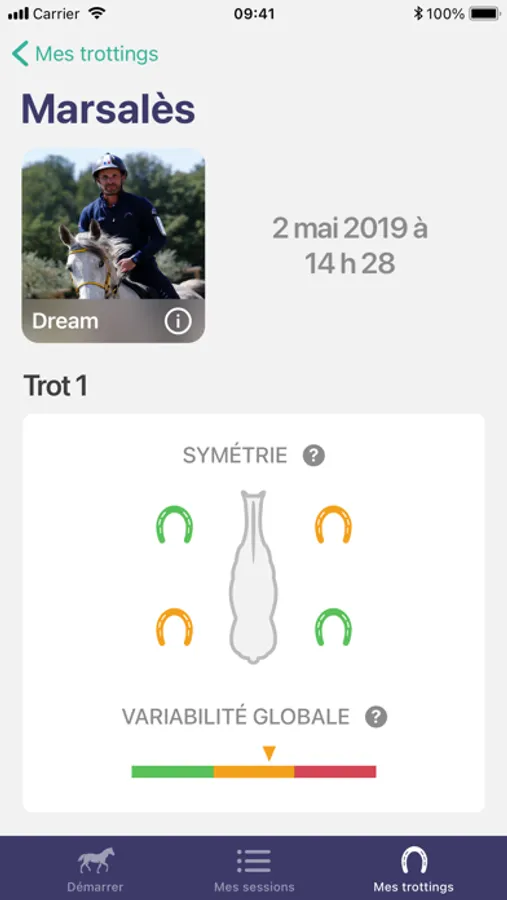 L'application vous propose également, à l'aide du capteur cheval uniquement, une analyse détaillée de la qualité de la locomotion de votre cheval trotté en main. Deux paramètres vous sont fournis : la variabilité globale du trotting (sa qualité) et la symétrie des diagonaux. À l'aide de l'historique, vous pouvez aussi suivre leur évolution en fonction du travail effectué. Une aide indispensable au suivi de la locomotion de votre cheval !