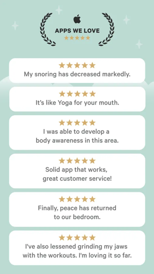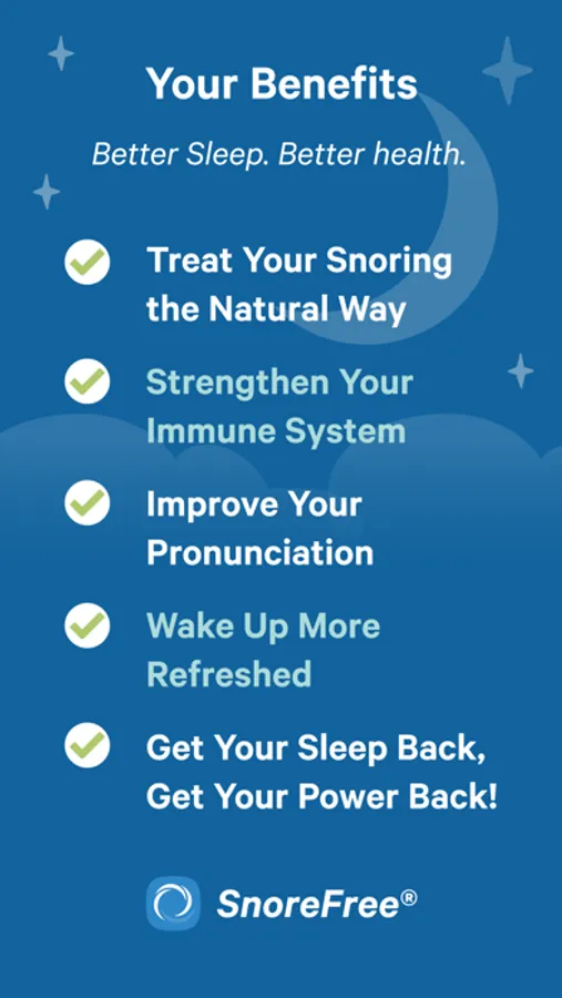 The SnoreFree app training has a well-founded scientific background & can significantly improve your sleep, strengthen the immune system by regaining healthy sleep, enhance the pronunciation & diminish your snoring. With simple oral gym exercises & no need of painful operations & expensive or uncomfortable devices.