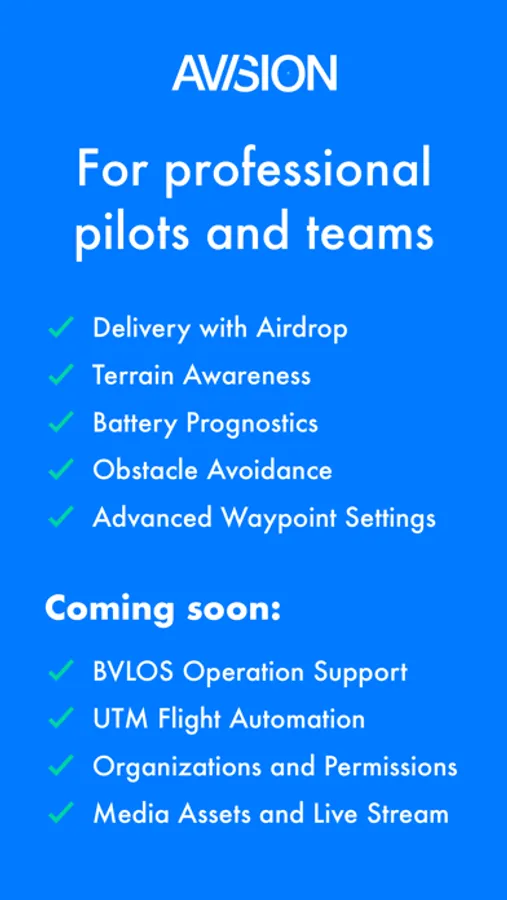 Avision™ provides drone pilots with information and tools to efficiently plan, approve (via automated FAA LAANC - Low Altitude Authorization and Notification Capability), and execute flight operations as well as track activity over time. Flight Intelligence™ offers automated flight plan validation against the constraints including regulations, weather, terrain, and obstacles. Avision UTM system provides essential fleet management services for BVLOS operations in advanced air mobility, aerial transportation and drone delivery. UTM functionality combined with live video streaming capabilities support extended situational awareness for first responders, public safety, and emergency response operations. To access services, user will be prompted to create an account and login. Fleet management and FAA LAANC commercial (part 107) require an upgrade to paid account. Information gathered by the App complies with company privacy policy. Per DJI SDK support notes, the following DJI models are supported.