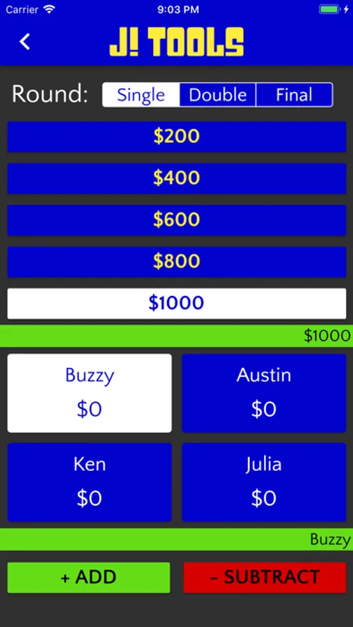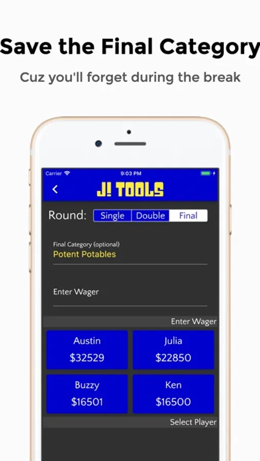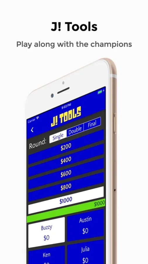 This app helps you quickly track player scores and game results regardless of whether you are playing along with the show or running your own Jeopardy! tournament. You can play any way you want: add, subtract, wager, or just tally; you choose what works for you!
